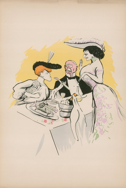 französisch · karikatur · karikatur · zeichnung · verheiratet · paar · herrin · abendessen · restaurant · wettbewerb · spargel · champagner · frauen · aggressiv · Private Collection / Bridgeman Images · / Look and Learn |