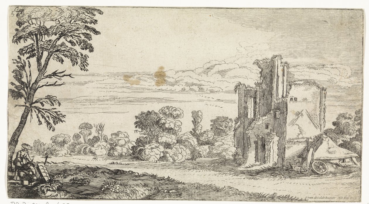 Landschaft mit Ruine (Landschaften)(Landschap met ruïne Landschappen (series title))Simon Poelenburg(print maker),Jan van de Velde (II)(after design by),Henri Le Roy(publisher) |