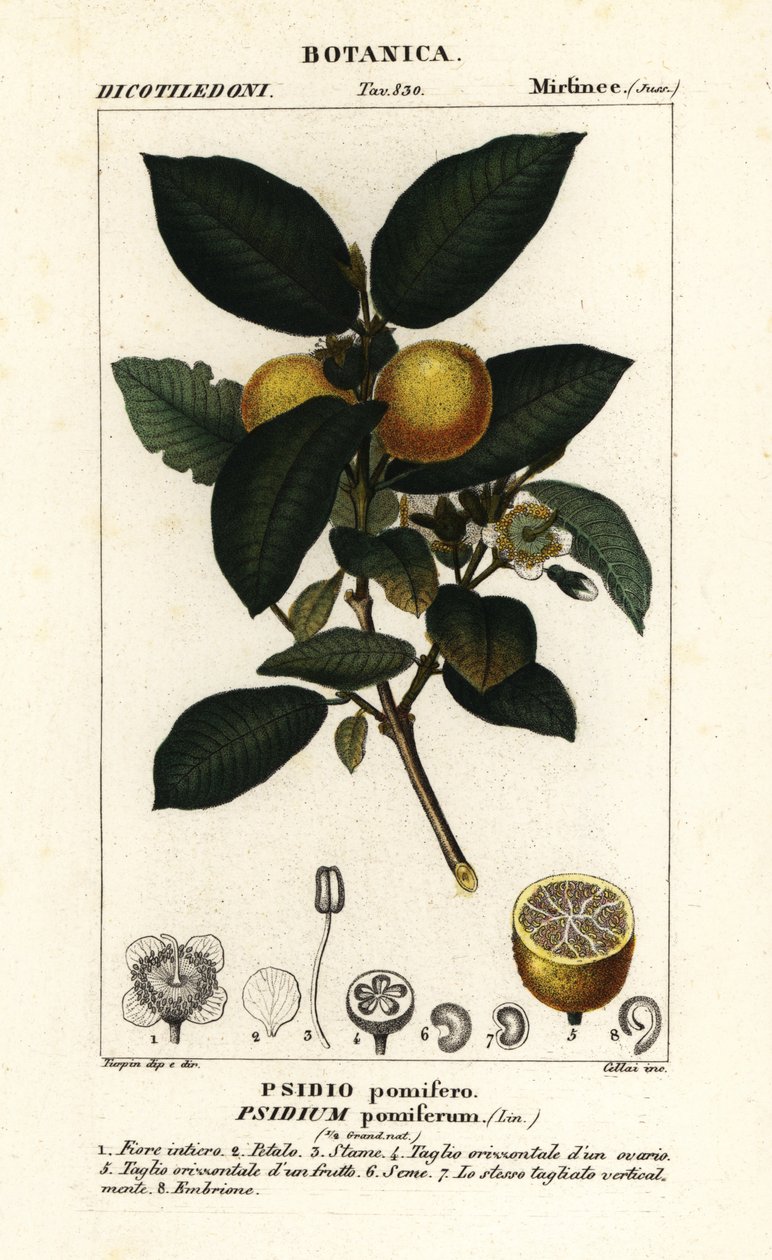 obst · botanik · botanik · naturgeschichte · wissenschaft · essen · gewöhnliche guave · gelbe guave · zitronenguave · psidium guajava · psidium pomiferum · psidio pomifero · cellai · handkoloriert · kupferstich · stipple gravur · dizionario delle scienze naturali · wörterbuch der naturwissenschaften · florenz · italien · illustration · pierre jean-francois turpin · botanische illustration · pflanze · essbar · gemüse · wissenschaft · naturkunde · botanik · Antoine Laurent de Jussieu · / Bridgeman Images