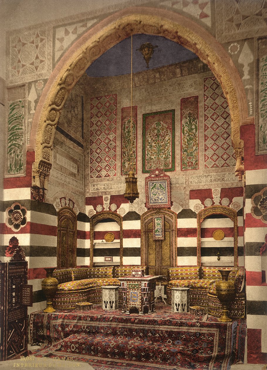 Innenansicht eines Empfangszimmers in einem feinen Haus, Damaskus, ca. 1880-1900(Interior of a reception room in a fine house, Damascus, c.1880-1900 (photochrom))Swiss Photographer |