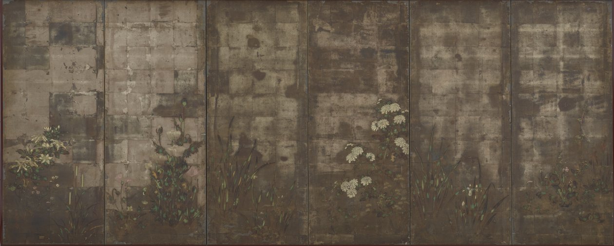 Blumen der Jahreszeiten(Flowers of the seasons, Screens (six-panel), 1600-30 (colour over silver on paper))Tawaraya Sotatsu |