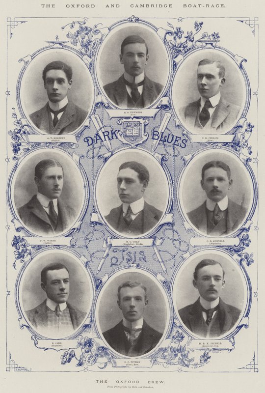 oxford · cambridge-regatta · oxford crew · at herbert · balliol · go edwards · ck philips · fw warre · hg gold · magdalen · schlaganfall · cd burnell · r carr · ro pitman · bogen · hrk pechell · brasenose · hochschulbootrennen · Rudern · Sport · Private Collection / Bridgeman Images · / Look and Learn