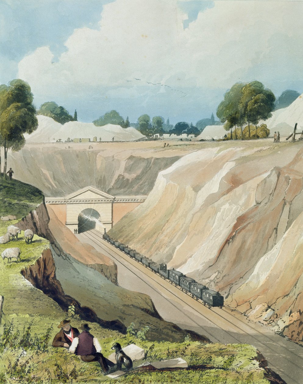 Eingang zum Tunnel in Watford, Platte 6 aus 'London und Birmingham Railroad', graviert von W. Fielding, veröffentlicht von Ackermann und Co., London, 1837(Entrance to the Tunnel at Watford, plate 6 from 'London and Birmingham Railroad', engraved by W. Fielding, published Ackermann und Co., London, 1837 )Thomas Talbot Bury |