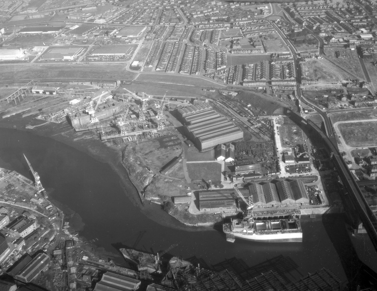 ingenieurwesen · industrie · industrie · boot · schiff · werft · bauen · bauen · bauen · sozialgeschichte · sunderland · tyne and wear · vereinigtes königreich · nordostengland · lagerhäuser · kräne · meer · wasser · von oben · landschaft · 1960er jahre · 60er jahre · 60er jahre · werft · Tyne & Wear Archives & Museums / Bridgeman Images