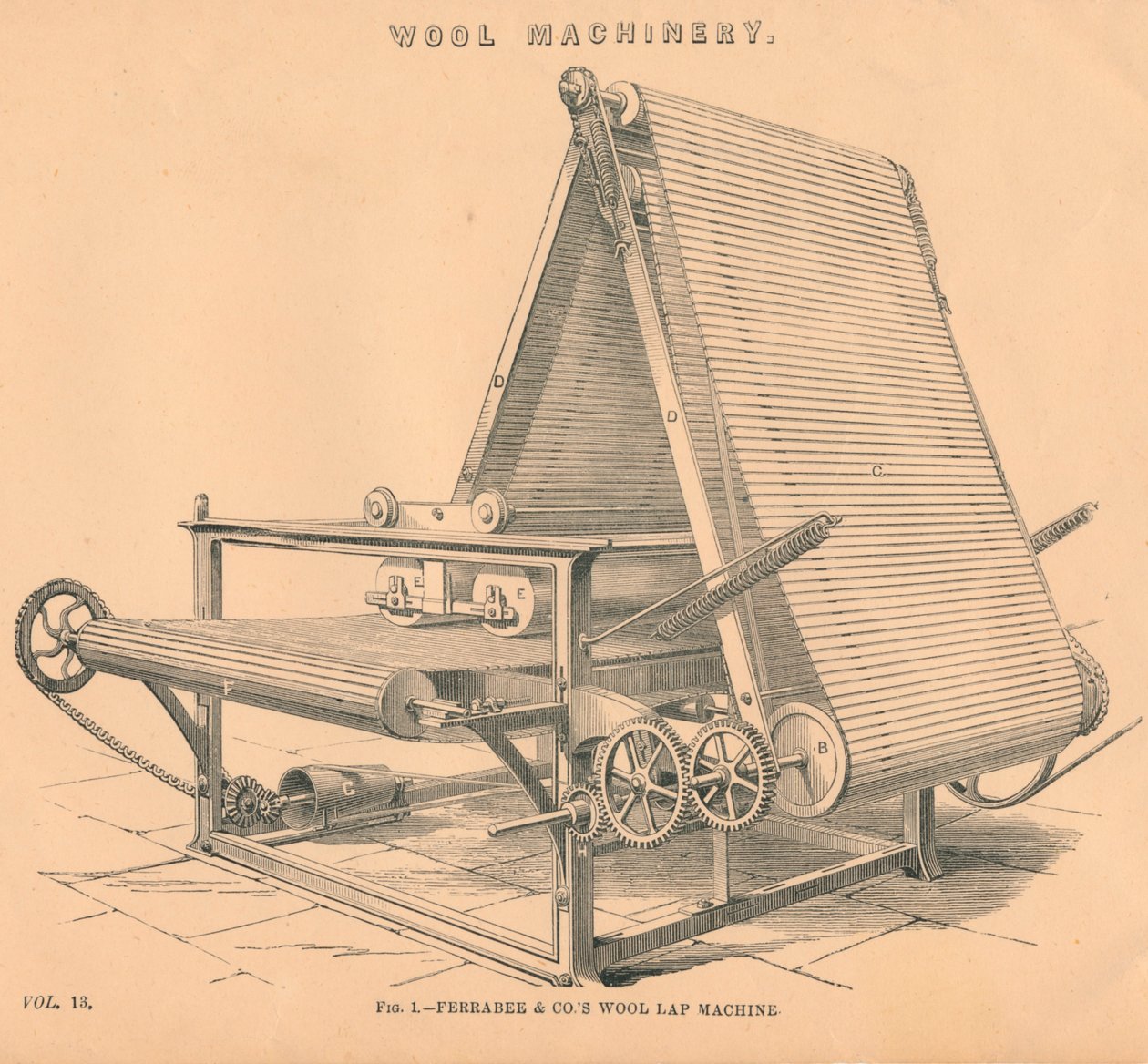 Wollmaschinen: Ferrabee & Co.s Woll-Lap-Maschine, um 1880(Wool Machinery: Ferrabee & Co.s Wool Lap Machine, c1880)Unbekannt |