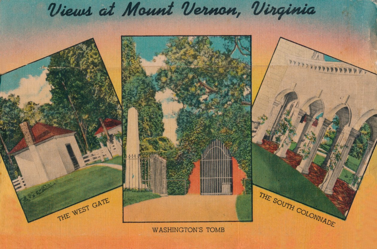 spielraum · kommunikationen · grenzstein · garten · land · ansicht · farbe · farbe · virginia · grab · mausoleum · eingang · gatter · kolonnade · position · jahrhundert · beerdigung · vista · weinlese · postkarte · konzept · vierziger jahre · beschriftung · forties · vereinigte staaten von ameri · vereinigtes s · postservice · einfassung vernon · 20. jahrhundert · amerikanisch · amerika · tourismus · lithograph · postcard · unknown · company · lower case · capitol souvenir company · capitol souvenir · The Print Collector/Heritage Images |