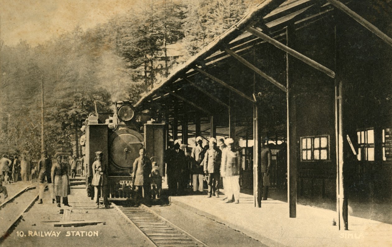 spielraum · transport · transport · außen · draußen · stehen · leute · mann · mann · männer · asiatisch · indien · asien · indisch · land · kerl · kontinent · britisch · gleis · struktur · station · bahnlinie · position · bahnhof · jahrhundert · kolonial · bahnschienen · plattform · zugstation · weinlese · großbritannien · zugschiene · bedeckt · bahnschiene · dreißiger jahre · zwanziger jahre · lokomotive · einfarbig · dais · schwarzes u. weiß · schwarzes und weiß · dreißiger jahre · zwanziger jahre · 1910s · 20. jahrhundert · himachal pradesh · simla · photograph · postcard · unknown · british india · The Print Collector/Heritage Images |