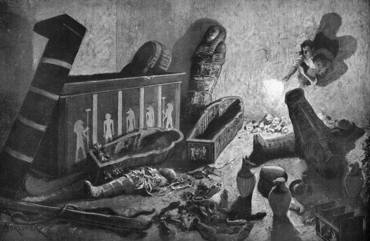 innen · zerstörung · wand · entdeckung · land · ägypten · verbrechen · ägyptisch · archäologie · raub · grab · mausoleum · position · jahrhundert · luxor · karnak · grab · beerdigung · senke der könige · kunstprodukt · konzept · mama · archäologischer aufstellungsort · archäologie · kunstprodukt · sarg · einfarbig · schwarzes u. weiß · schwarzes und weiß · alter ägypter · sarcophagi · sarkophag · thebes · grave robber · ransacked · unknown · amedee forestier · forestier · amedee · The Print Collector/Heritage Images |