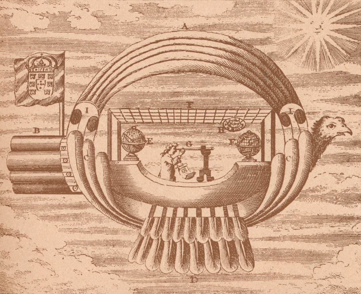 transport · transport · himmel · fliegen · markierungsfahne · markierungsfahnen · land · sonne · portugal · flug · wissenschaft · schiff · schiffe · solarsystem · astronomie · design · flugzeug · position · jahrhundert · fahne · luftfahrt · portugiesisch · erfindung · einfarbig · standard · lufttransport · wassertransport · schwarzes u. weiß · schwarzes und weiß · 18. jahrhundert · luftschiff · lenkbares · achtzehntes jahrhundert · etching · unknown · bartolomeu de gusmao · gusmao · bartolomeu de · The Print Collector/Heritage Images |