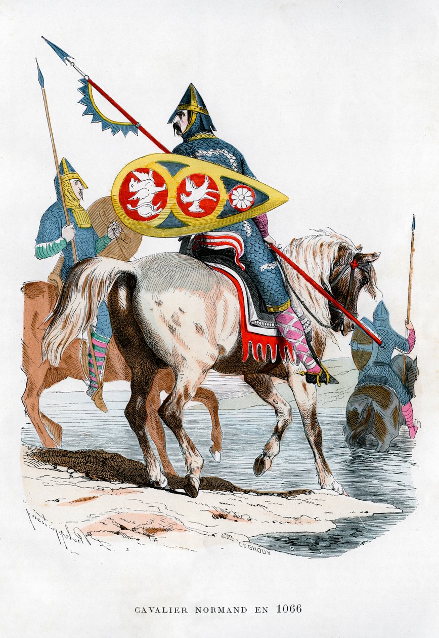 tier · tiere · pferde · pferd · reiten · mitfahrer · land · französisch · frankreich · waffe · waffen · farbe · farbe · kleid · rüstung · angebracht · krieg · krieger · position · sturzhelm · soldaten · soldat · ritter · zu pferde · schild · konzept · schlacht · kavallerie · armee · kriegsführung · kampfmittel · normannisch · lanze · engraving · unknown · The Print Collector/Heritage Images