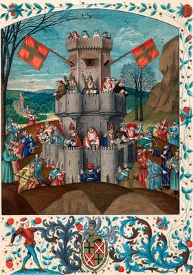 gebäude · gebäude · fromm · markierungsfahne · markierungsfahnen · aufsatz · religion · glaube · mönch · mönche · schloß · farbe · farbe · verteidigen · mittelalterlich · festung · christentum · verstärkung · krieg · katholisch · katholizismus · jahrhundert · fahne · römisch-katholisch · konzept · verteidiger · manuskript · bishop · standard · papst · mittelalterlich · mittleres alter · wappen · römischer katholizismus · heraldry · belagerung · ann ronan pictures · chromolithograph · unknown · Ann Ronan Picture Library/Heritage-Images
