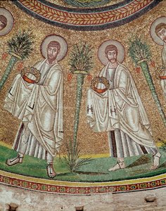 Die heilige Praxedis und der heilige Paulus (Detail). Anonymes Mosaik um 830. Triumphbogen der Basilika Santa Prassede, Rom(Saint Praxede (Prassede) and Saint Paul Detail. Anonymous mosaic around 830. Triumphal Arch of the Basilica of Santa Prassede, Rome)Unknown artist |