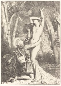 Roland befreit Olympe - Gravur von 1851 aus „Roland der Rasende“ (Orlando furioso) (16. Jahrhundert) von Ludovico Ariosto, bekannt als der Ariosta - Ausgabe, übersetzt aus dem Italienischen von Graf von Tressan und veröffentlicht von Gustave Harvard 1851(Roland delivre Olympe - engraving of 1851 from “” Roland furieux”” (Orlando furioso) (16th century) by Ludovico Ariosto, known as the Ariosto - Edition translated from Italian by the Count of Tressan and published by Gustave Harvard 1851)Unknown artist |