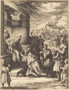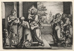 Royaumont-Bibel, Neues Testament: Reinigung der Jungfrau oder Darstellung im Tempel. Die Heilige Familie bietet Jesus Christus dem Tempel an und übergibt ihn Symeon. Eine Frau hält zwei Tauben in einem Korb. Illustration von 1811.(Royaumont Bible, New Testament: Purification of the Virgin or presentation in the Temple. The Holy Family offers Jesus Christ to the Temple and gives it to Symeon (or Simeon or Simon). A woman holds two doves in a basket. Illustration from 1811.)Unknown artist |