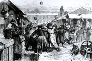Ostertag in Russland: der Brauch der Eier in der Moskauer Regierung. Gravur in „Le Parisien“(Easter Day in Russia: the custom of eggs in the Moscow government. Braces of the inhabitants offering red eggs to celebrate the resurrection of Christ. Engraving in “” Le Parisien””)Unknown artist |