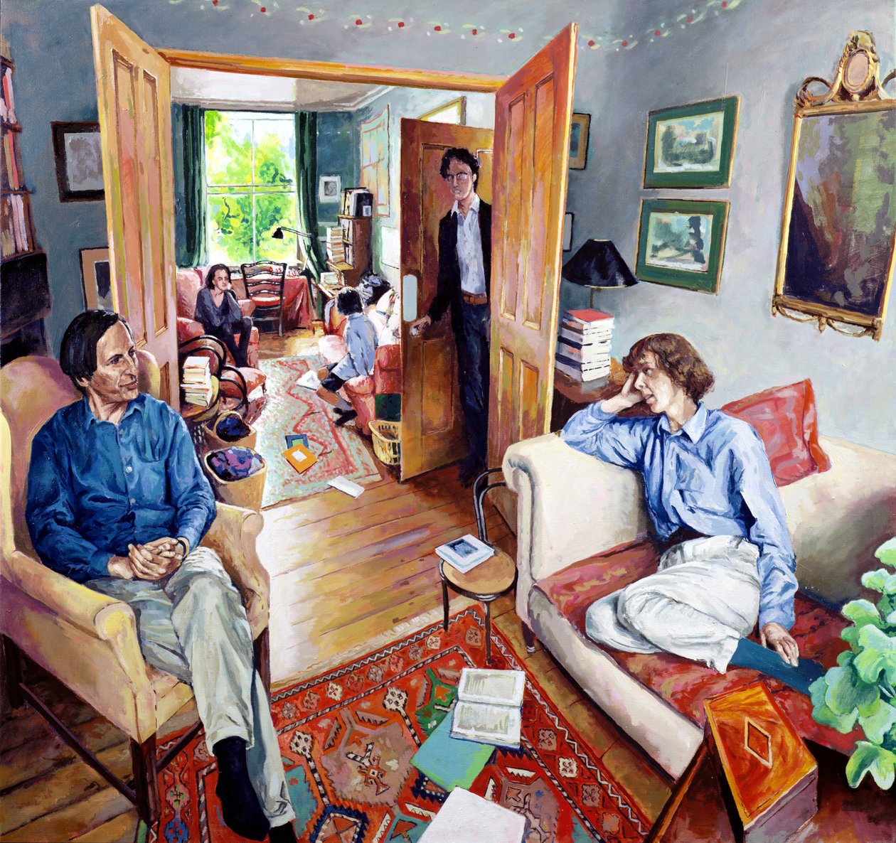 interieur · einfamilienhaus · wohnzimmer · wohnen · zeichnen · sofa · sessel · gespräch · unordentlich · kind · schreibtisch · eltern · alltagsszene · bücher · besucher · mittelklasse · haushalt · Private Collection / Bridgeman Images |