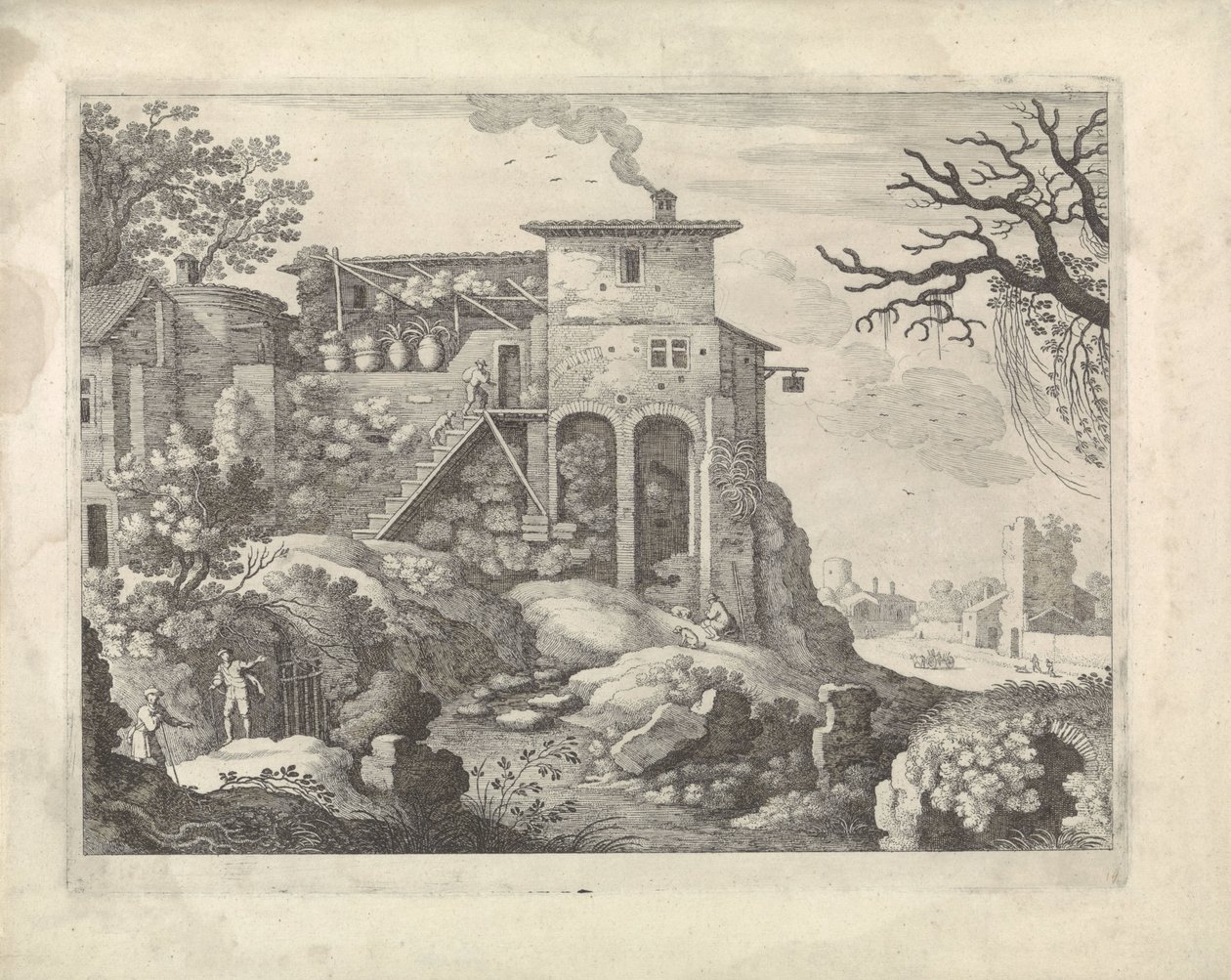 Italienische Landschaft mit einem Gasthaus(Italiaans landschap met een herberg)Willem van Nieulandt (II)(print maker),Paul Bril(after design by) |
