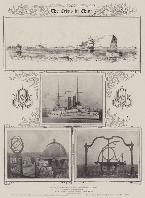 krise · china · taku forts · bombardiert · gefangen · befugnisse · 17. juni · hms orlando · kreuzer 1. klasse · chinesische gewässer · astronomische instrumente · peking · jesuisten · alte astronomische bronzeinstrumente · wand · die architektur · schiffe · maritim · Königliche Marine · Private Collection / Bridgeman Images · / Look and Learn |