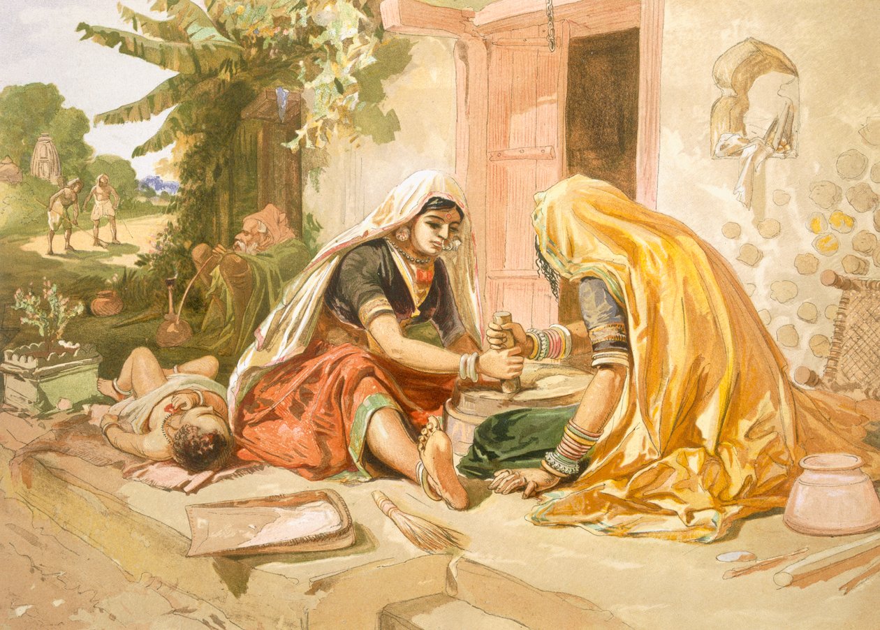 inder · britischer raj · asien · asiate · frauen · arbeit · arbeit · hausarbeit · grundnahrungsmittel · hausarbeit · alltagsszene · kochen · zubereitung von speisen · traditionelle kleidung · tracht · sitzen · saris · sonnig · idyllisch · rustikal · ländlich · bauern · al fresco · draussen · draussen · hütte · familie · kind · ältere menschen · jung · Private Collection / Bridgeman Images |