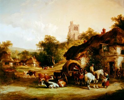 getränk · trinken · getränke · pflug · anhänger · kupplung · transport · landwirtschaftliches fahrzeug · landwirtschaftliche geräte · landwirtschaft · landwirtschaft · landwirtschaft · mechanik · bauer · ländlich · flirtend · kirche · weibchen · pflug · rinder · englisches dorf · kneipe · ländlich · strohgedeckt · bardame · malerei · Mzpainting · Private Collection / Bridgeman Images