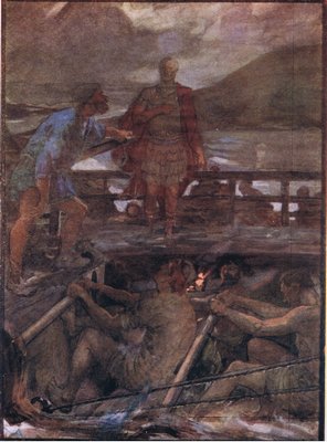 Caesar und der Pilot, Illustration aus 'Plutarch's Lives for Boys and Girls', nacherzählt von W.H. Weston, London ca. 1910(Caesar and the pilot, illustration from 'Plutarch's Lives for Boys and Girls', retold by W.H. Weston, London c.1910 (colour litho))William Rainey |