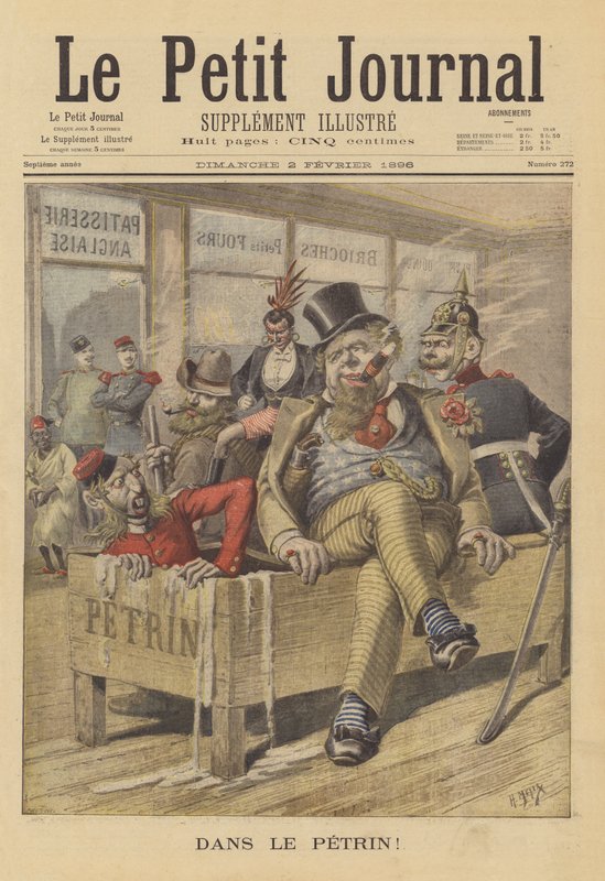 19. jahrhundert · französisch · karikatur · satire · satirisch · karikatur · allegorie · trog · Ärger · dilemma · großbritannien · vereinigte staaten · vereinigte staaten von amerika · amerika · buren · deutschland · kolonialismus · imperialismus · zigarre · unglück · verlegenheit · britisches imperium · jameson raid · venezolanische krise · großmächte · politik · rivalität · rivalen · auslandsbeziehungen · Private Collection / Bridgeman Images · / Look and Learn |