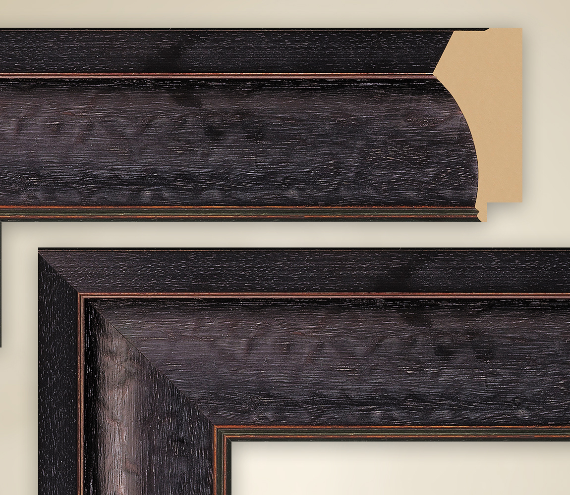 | Mit einer ausgesprochen ausgefallenen Gesamtbreite präsentiert die Rahmenreihe Marais II das Modell Alexia. Auf 85 mm haben die Designer die Echtholzleiste in der Frontansicht gebracht und damit einen ausgefallenen Zierrahmen geschaffen. In der höchsten Höhe, die in den Raum ragt, liegt Alexia bei 43 mm. Diese kommen gleich im oberen Bereich des Rahmens zum Vorschein. Als flache Ebene in einem etwa 45 Grad Winkel streckt sich die schmale obere Leiste in den Raum. Sie hat die Farbgebung French Ebony, die über den gesamten Rahmen gebracht wurde. Am Ende dieser schräg abgesenkten Leiste haben die Macher eine sehr dünne Holzleiste in Rot angesiedelt. Zum dunklen Ebenholzton bildet diese Borte einen herrlichen Kontrast. In selbem Ton, als schmale Doppelleiste kreiert, tritt eine schmale Variante nochmals im Rahmeninneren in Erscheinung und sorgt auch hier für einen gekonnten Abschluss. Den mittleren Hauptteil jedoch dominiert French Ebony auf der breiten Borte, die im konkaven Stil gearbeitet wurde. In seiner Gesamtheit tendiert der Rahmen aufgrund der dunklen Farbe und der immensen Breite zu einem Rahmen, der ganz besondere Motive rahmen kann. Diese dürfen im Falle von Alexia einen ebenso monumentalen Charakter besitzen. Bekannte Monumentalmaler waren zum Beispiel Johann Peter Krafft, Vaclav Sochor oder Alexander Kircher. Während die ersten beiden Historisches zu Werke brachten, war letzterer ein Landschaftsmaler - beides Genres, die mit dem Rahmen Alexia harmonieren. |