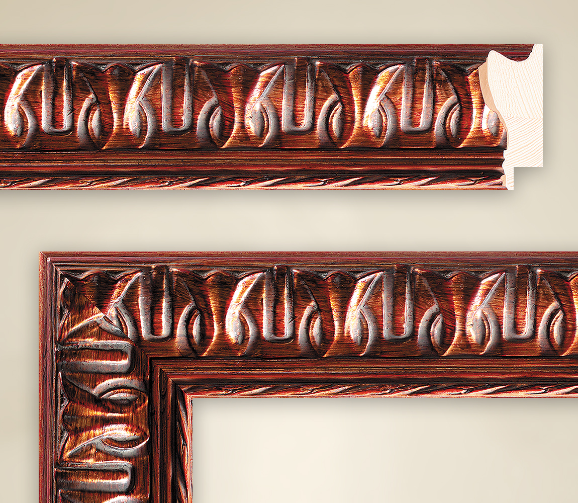 Bronze in ihrer schönster Variation - eine getreue Nachahmung des Edelmetalls zeigt die Farbgebung des Zierrahmens Naomi. Die herrliche Nuance ist hier in mehreren Farben zusammengestellt worden - dabei kommen neben tiefroten Auftragungen ebenso hellorangefarbene, leicht gold glänzende, schwarze und bräunliche Elemente zusammen, die diesen eleganten Bronzeton erzeugen. Er zieht sich über alle Bereiche des Rahmen, vom Bildinneren, über zwei weitere schmale, schlichte Leisten und die ornamentreiche Mittelleiste bis hin zum oberen Rahmenabschluss. Während sich zwischen Zierelementen und Grundrahmen hier und da schattenartige Bereich in Schwarz edel hervortun, sind wiederum die großen Schnitzereien auf dem Hauptrahmen auf ihren Wölbungen mit Silberfarbe versehen. Nicht zu hundert Prozent deckend ist das Silber aufgetragen, eher wie ein leichter Film, der allein den Glanz des gesamten Bilderrahmens noch verstärken soll. Wer seiner Phantasie gern freien Raum gibt, kann auf diesem Teil sich nach oben öffnende Lilienblüten sehen, die sich jeweils mit einem großen U abwechseln. Beide Elemente bilden in der Gesamtansicht wiederum eine Struktur, die an ein gemeißeltes Relief erinnert. In Naomi fühlen sich Motive wohl, die gern von einem edlen Charakter begleitet werden, um gemeinsam einen künstlerischen Hingucker an der Wand zu bilden.